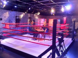 Aan vechtlust geen gebrek; oprichter CatchYourTalent Marie-José van den Kommer in de boksring met Olympisch medaillehouder ‘Arnold Vanderlyde’ voor een lekker potje ouderwets sparren! Dit in het kader van de ‘best presterende werkgever van Nederland’. De opnamen stonden geheel in het teken van vechten voor de prijs en werd hoe toepasselijk ook in een boksring gehouden. Het interview start in de lockerroom, waar Arnold Marie-José kort introduceert om vervolgens in de ring een 2 minuten durende sparring sessie te houden. Wie er wint? Kijk zaterdag 17 september om 16.00 uur op SBS6!