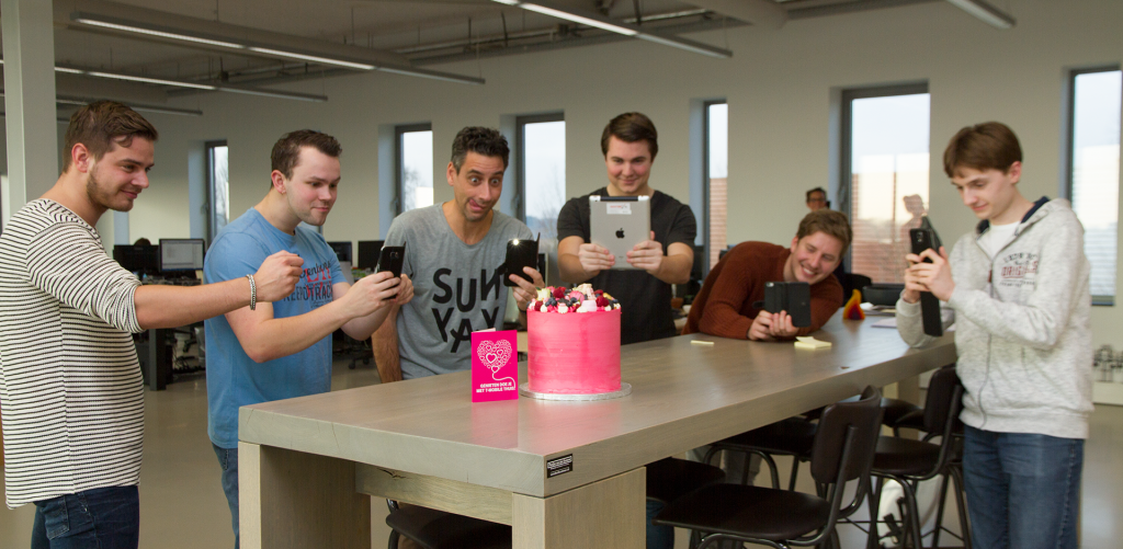 Hier wordt een mens (lees heel bedrijf) toch intens blij van! In verband met de overgang van Vodafone Thuis naar T-Mobile Thuis kregen wij deze prachtige taart aangeboden. Wij hebben er werkelijk eerst een minuut of tien flink naar staan staren totdat Paula Bramer de heftige taak op haar nam en het mes in de taart zette.